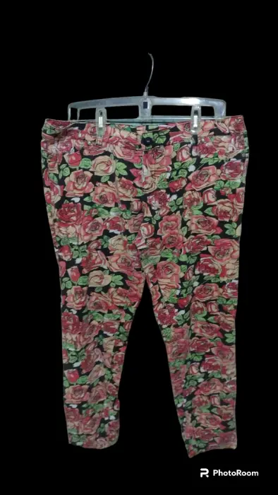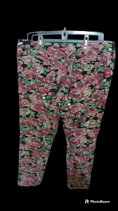 Pantalón floreado t/g. Pantalón a la cadera, regular fit, estampado de flores con más color rojo, talla grande.