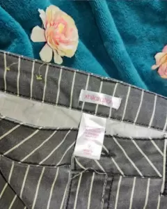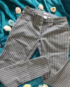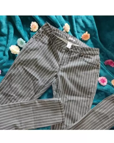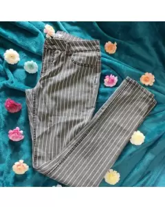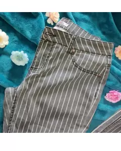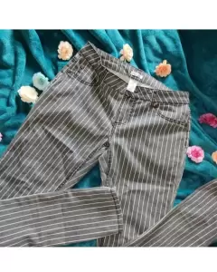 Pantalón gris con rayas blancas en talla 9, estira.Composición: 64 algodón, 33poliester y 3 spandex.Envío todos los días de lunes a sábado