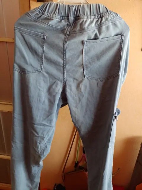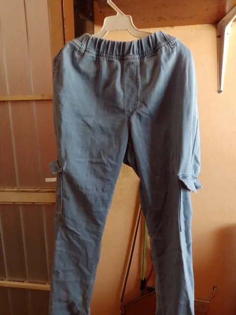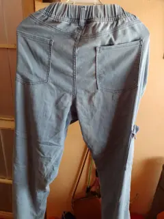 Pantalón tipo cholo, mezclilla con bolsas a los costados pretina elástica, al igual que en bastilla con elástico, talla 11