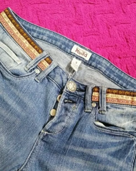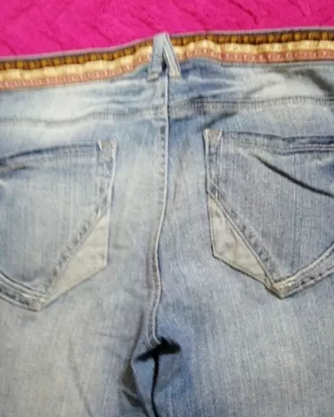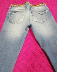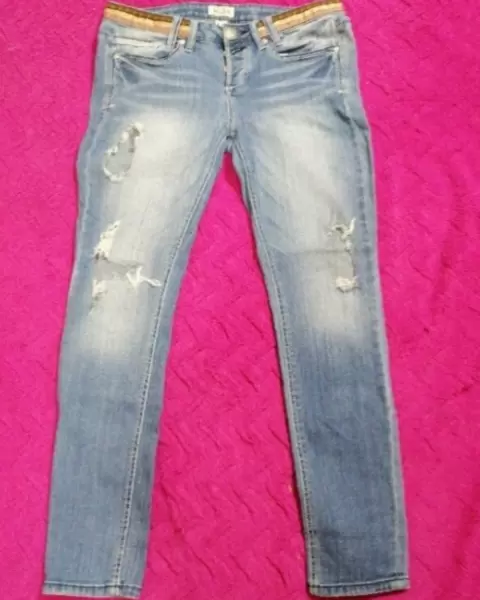 Pantalón de mezclilla razgadoEntubadoAla cinturaTrae detalle tipo cinto de tela en la pretinaTalla 9
