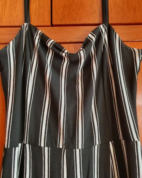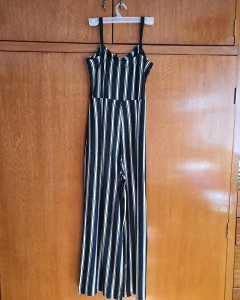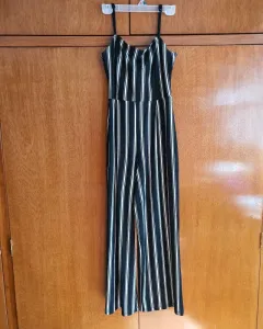 Pantalon palazzo. Mono de pierna ancha color negro y franjas blancas, de tirante ajustable