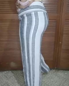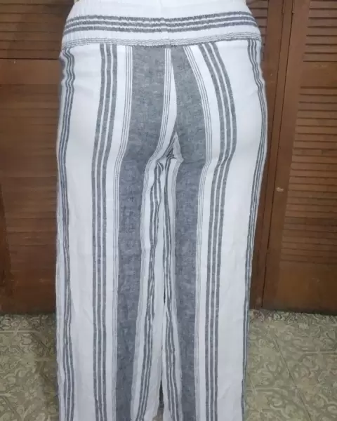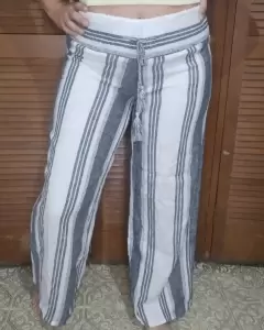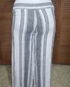 Pantalón pierna ancha. Pantalón tipo mantaBlanco con rayas azulesLlega abajo del ombligoTiro medioTalla 7-9Pierna ancha
