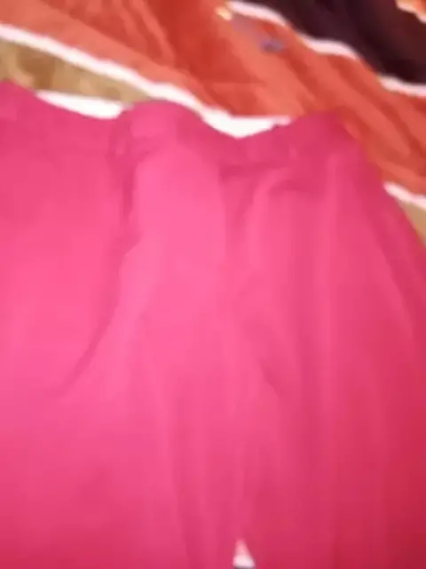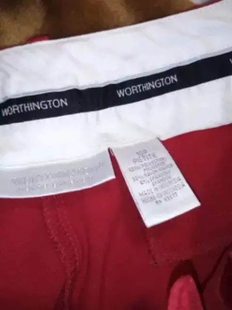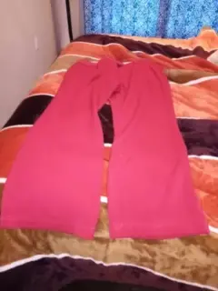 Es rojo color sin desgaste, con pretina se abrocha enfrente, cierre enfrente, bolsas atras