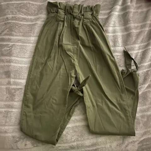 Pantalon Skinny a la cintura, color verde militar, talla S, largo 3/4’s. No se estira, no stretch, tiene cinturón del mismo color. Puesto luce muy bonita figura.