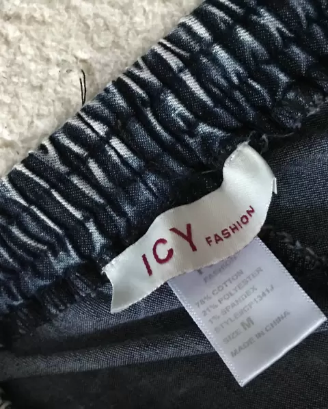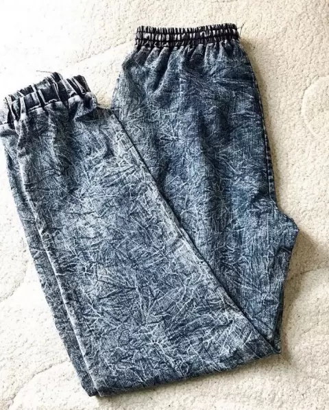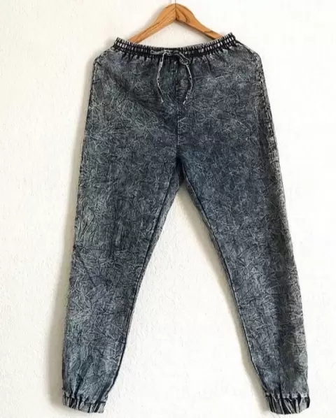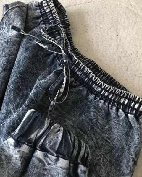 Pantalón tipo baggy de mezclilla muy delgada, con resorte en cintura y tobillos, tiene jareta al frente, sin bolsas traseras y delanteras. Súper cómodo.