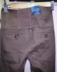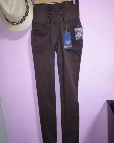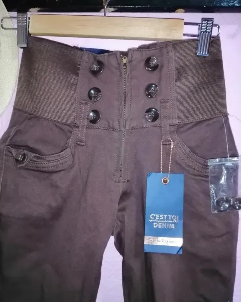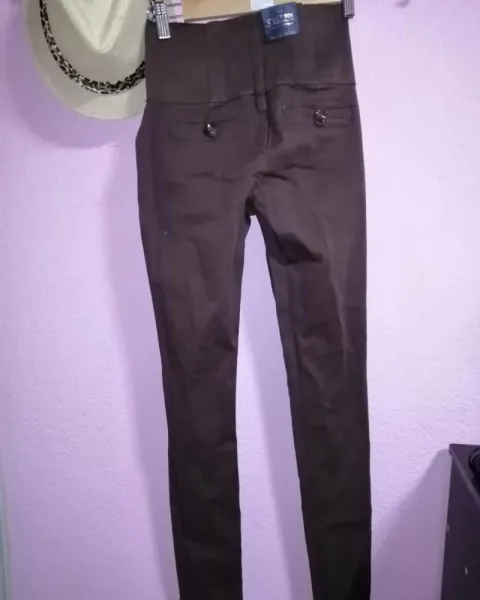 Pantalón tiro alto, tela gabardina estrech, tiene una pretina ancha y elástica, botones decorativos al frente, entubado. Color café