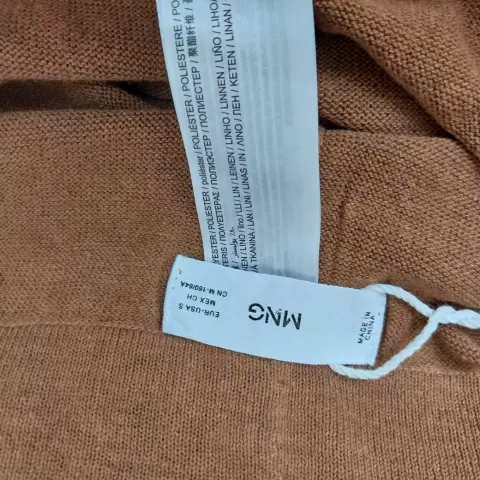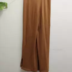 El pantalón lo usé dos veces. Le subí la bastilla, pero no esta cortado. Es super largo . Talla S. El café tiene destellos dorados que no se notan casi nada. Son de resorte. Están en excelente estado. La marca es Mango.
