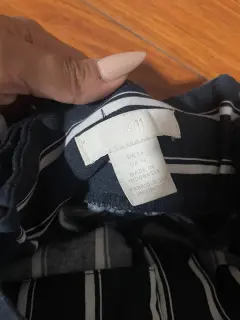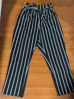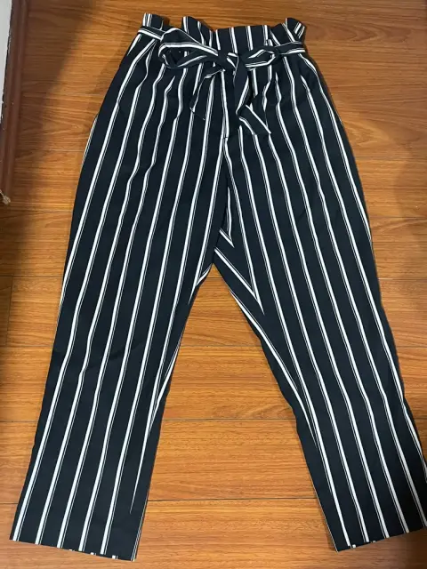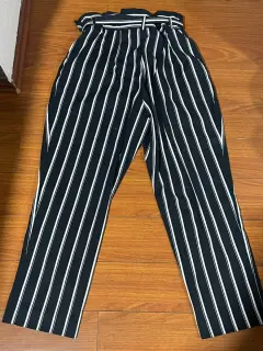 Pantalones Con Cinturón de tela Con Estampado De Rayas. Talla 14 H&M. Medidas cintura 43cm, cadera 49cm, tiro 37cm, largo 109cm. Sin detalles. Azul marino con blanco.
