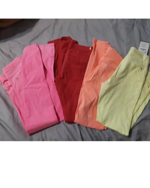 El amarillo es Zara, nuevo con etiqueta, los demás son Pull&Bear. Amarillo mide 40 cm cintura y 43 cadera, rosa 35 cintura y 43 cadera. Rojo 36 cm cintura y 42 cadera. Naranja 35 cm cintura y 41 cm de cadera. El precio es por todo. Puedo vender por separado.
