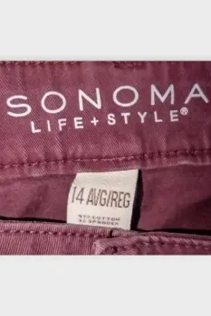 SONOMA Pantalón Regular Algodón Rojo XXL 14. SONOMA Pantalón Regular Dama Algodón Rojo XXL 14Marca: SONOMAOrigen: ChinaMaterial: 97% Algodón 3% SpandexTalla: XXL - 14Estilo: RectoPatrón: RegularColor: RojoCierre: Cremallera y BotónCintura: 44 cmCadera: 53 cmLargo: 105 cmTiro: 21 cmMuslo: 30 cmEntrepierna: 33 cmRopa de USO en muy buen estadoModelo único Lo que ves es lo que comprasAclara todas tus dudas antes de comprar