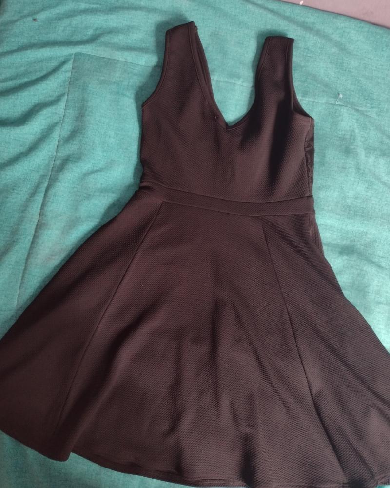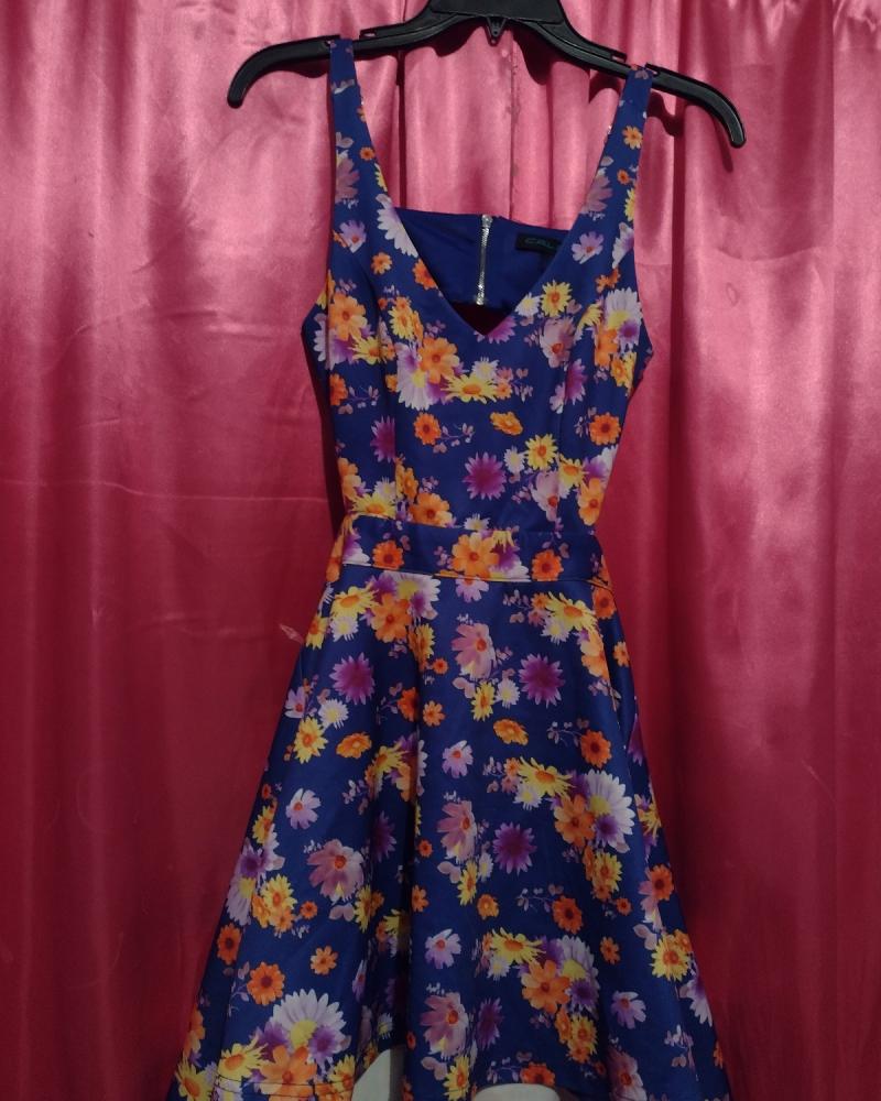1 vestido negro corte circular con encaje en el pecho. 1 vestido de flores de colores fondo azul rey con escote en la espalda. 1 falda floreada en fondo azul cielo con elástico y lazo en la cintura. 1 falda floreada en fondo rosa viejo con elástico y lazo en la cintura Todo talla chica