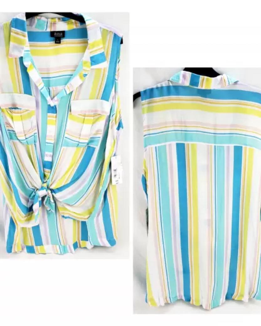 Una camisa sin mangas, de botones y a rayas en tonos pasteles marca A.N.A y una playera de cuello V en tono azul claro de material super suave y ligero marca A.N.A ambas en talla M