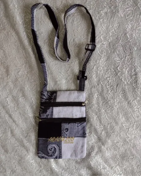 Bolsa de cruzada de Acapulco Es negro con blanco y fijuritas, le puede caber tu cel, tu cartera y otras cositas. :) Linda bolsa cruzada artesanal Color morado y fiusha. Esta nueva, nunca la usé. Más 2 prendas de regalo y 1bolsa de regalo 👌