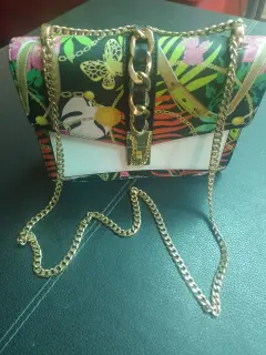 Hermoso Crossbody, blanco con diseño mariposas y cadenas ➕ Sandalias cruzadas con tacón circular marca Cloe. Aprovecha el Súper Paquete.