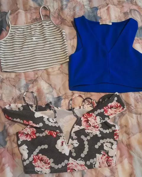 1 top nuevo deportivo de tirantes rayas blancas y grises. 1 crop top azul nuevo azul con escote "V" 1 crop top nuevo a los hombros escote profundo en "V" en pecho en color gris con flores. 1 crop top color melon neón nuevo. 1 crop top nuevo con tela transparente blanco con leve detalle en la maya donde estaba guardado. 1 maxi blusa tela transparente rosa.