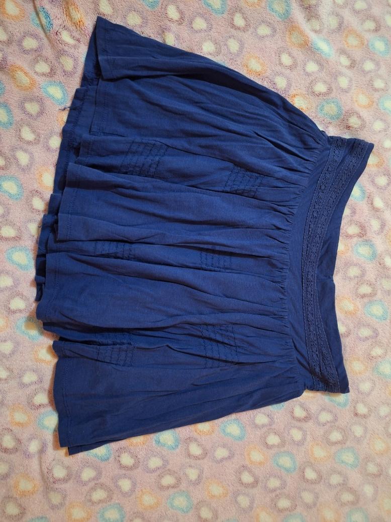 Juego de faldas. Dos faldas. Una es una falda de mezclilla con bolsas. La otra es una falda azul marino, corta, con algo de vuelo, con forro. Ambas quedan a una persona talla M