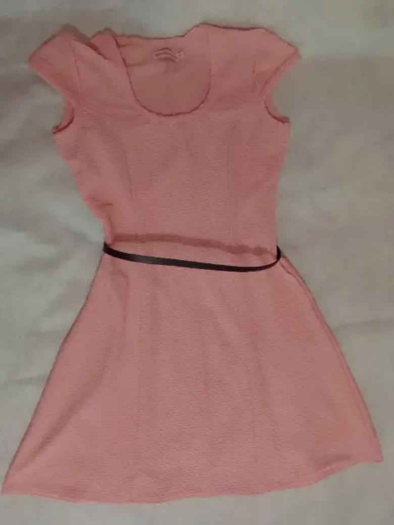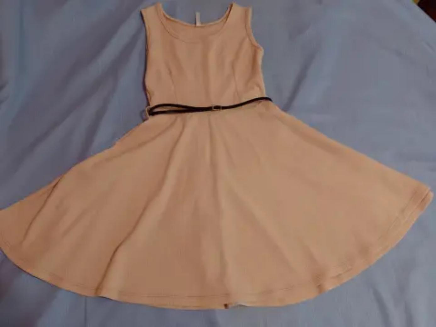 Tres vestidos casuales pero elegantes Uno es color beige, unitalla de vuelo, sin manga Otro vestido de encaje, sin manga, color negro, talla L. El último es de color rosa claro, unitalla, con algo de vuelo y manga cortita