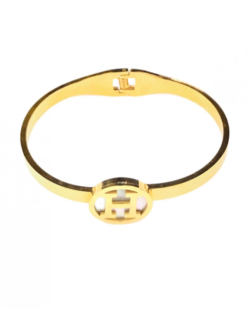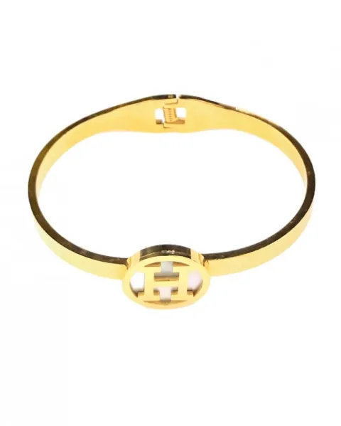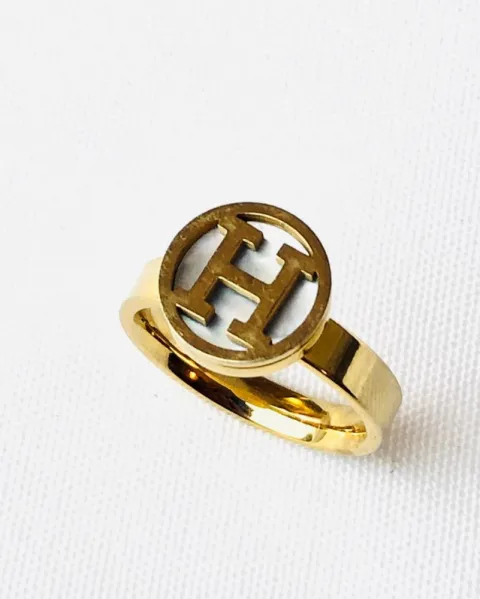 Pulsera y anillo golden H. Llévate el juego de anillo y pulsera en acero inoxidable dorado con fondo nácar, el anillo es del No. 8. Te va a encantar este juego.
