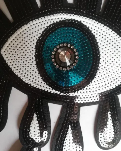 Parche ojo turco hecho de lentejuela con brillantitos en el centro. Tiene medidas aprox. de 27 x 22 cm.