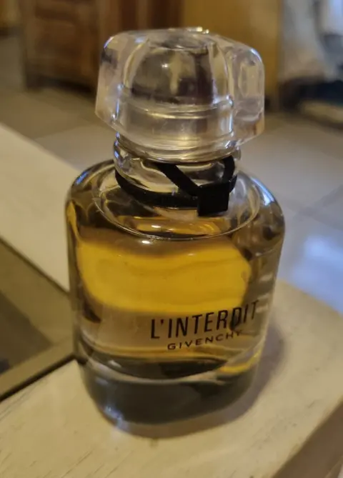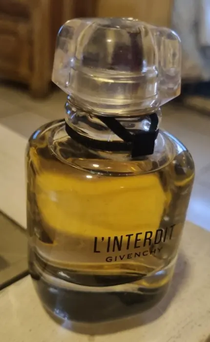 L'Interdit Eau de Parfum Givenchy. Las Notas de Salida son pera y bergamota; las Notas de Corazón son nardos, flor de azahar del naranjo y jazmín sambac (sampaguita); las Notas de Fondo son pachulí, vainilla, ambroxan y vetiver.
