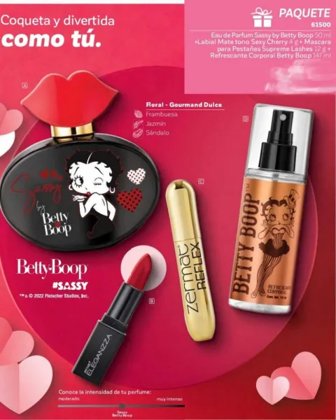 Paquete Betty Boop:**Eau perfume**Refrescante corporal**Labial mate**Mascara para pestañasAroma floral-dulce