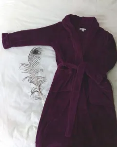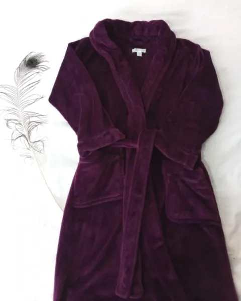 Bata para estar en casa, afelpada, super suavecita color guinda.Tiene un poco de hilitos de uso, solo se ven a contra luz.Muy cómoda, ideal para estar en casa en invierno.Tiene bolsas a los lados y una cinta para ajustar a la cintura.