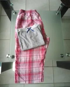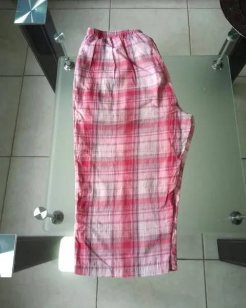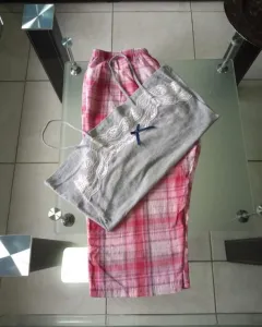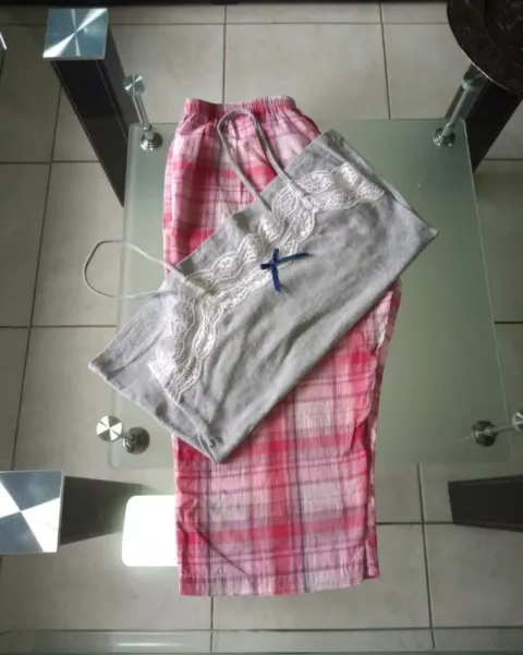 Pijama Capri Cuadros, color rosa con lila, marca fenteng T -M-G.Blusa con tirantes y encaje, en color gris. Talla GMarca Vicky Form.Muy buen estado, sin detalles.
