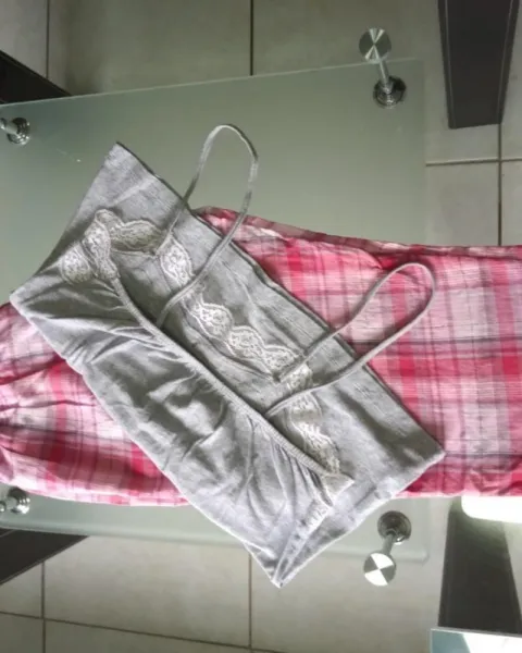 Duo, Pijama Capri y Blusa de Tirantes. Pijama Capri Cuadros, color rosa con lila, marca fenteng T -M-G.Blusa con tirantes y encaje, en color gris. Talla GMarca Vicky Form.Muy buen estado, sin detalles.