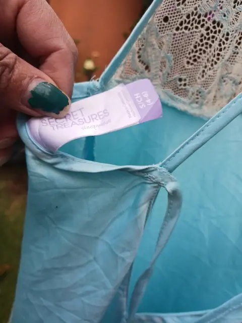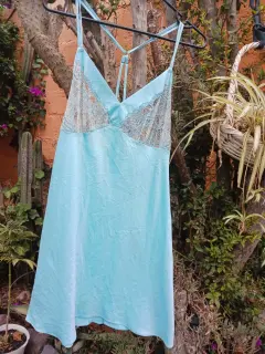 Bonito camisón corto, azul con encaje y tiras en la espalda para ajustarlo. Cómodo y fresco