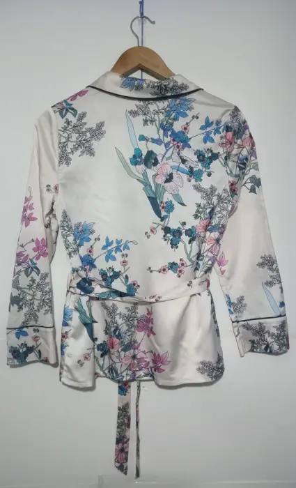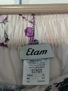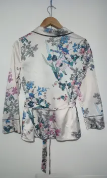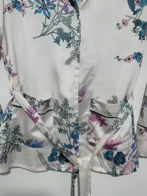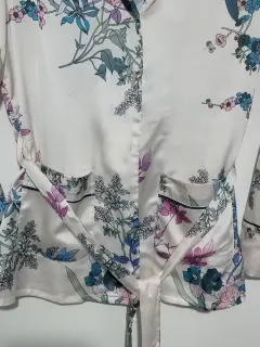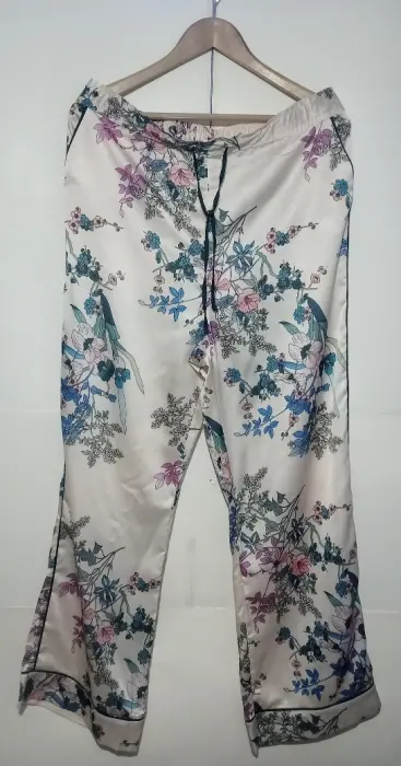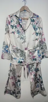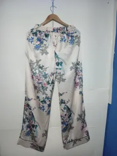 Pijama de dos piezas, color perla con flores, tiene diferente talla, la camisola es talla chica y el pantalon es talla extra grande, la tela no estira