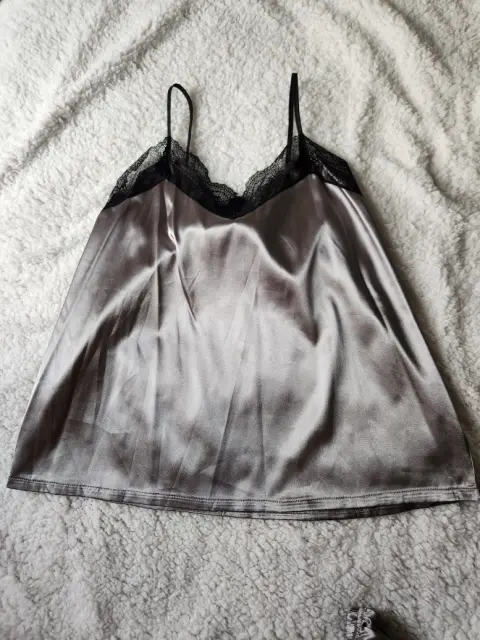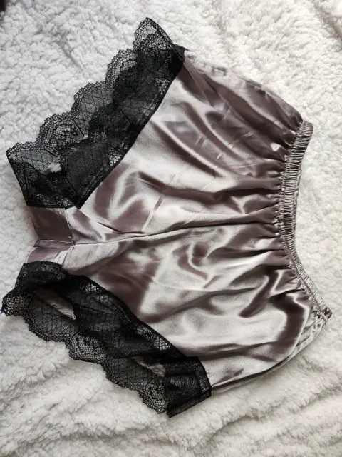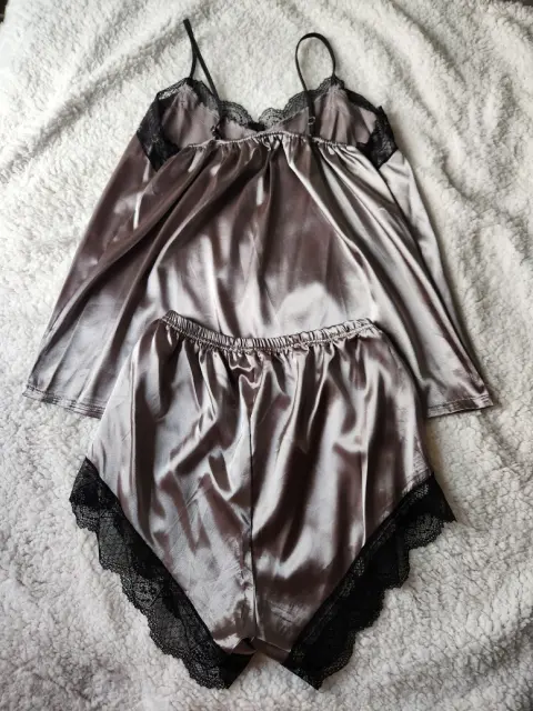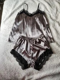 Pijama. Pijama color gris de tela satinada, blusa de tirantes y short con encaje negro, es lijera para este calor, cómoda y sexy.