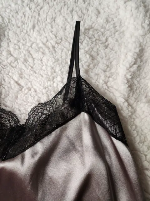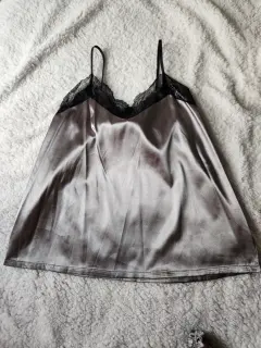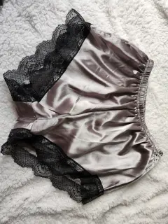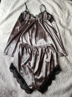 Pijama color gris de tela satinada, blusa de tirantes y short con encaje negro, es lijera para este calor, cómoda y sexy.