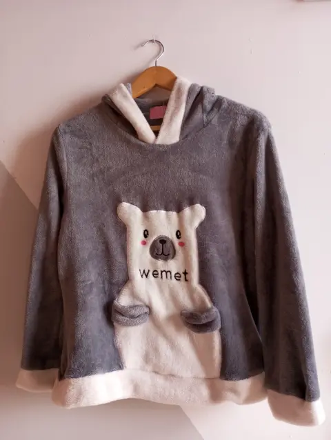 Pijama calientita. Pijama de tela polar, talla M, color gris. Tiene detalle de oso al frente y en el gorro orejas de oso, es muy cómoda y muy calientita. Cualquier duda con gusto te atiendo. Gracias por tu visita!