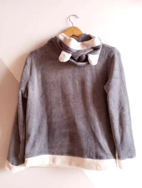 Pijama de tela polar, talla M, color gris. Tiene detalle de oso al frente y en el gorro orejas de oso, es muy cómoda y muy calientita. Cualquier duda con gusto te atiendo. Gracias por tu visita!