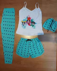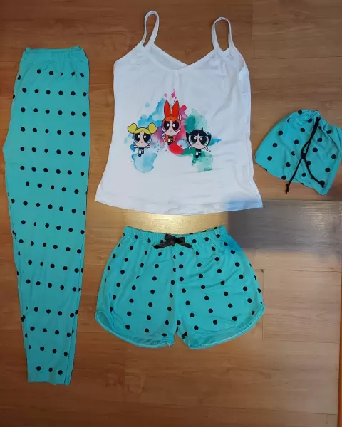 Bonito set de pijama de las chicas super poderosas. Es unitalla, viene con 4 piezas que incluye, short, pantalón, blusa y bolsita de tela para guardar pijama. Es nuevo sin etiqueta la tela es brush por lo tanto Es muy suave y fresca, perfecto para cualquier temporada y aquí contiene la opcion de elegir short o pantalón