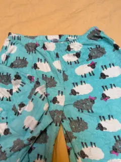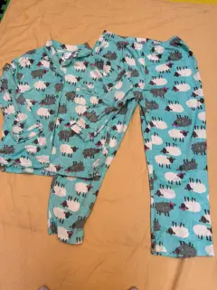 Una hermosa pijama polar delgado y calientito. Tiene detalles de bies azules y bolsa en el pecho. Las medidas son de blusa: 48 cm de hombro a hombro, talle 54 cm y pantalón: 41 cm de cintura, cadera 61 cm sin estirar y tiro 34 cm