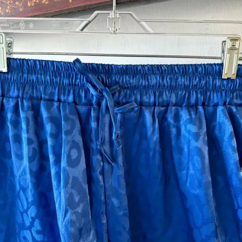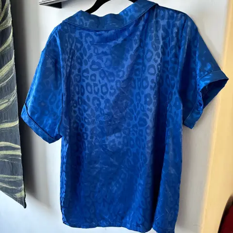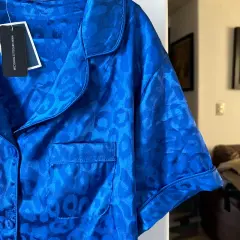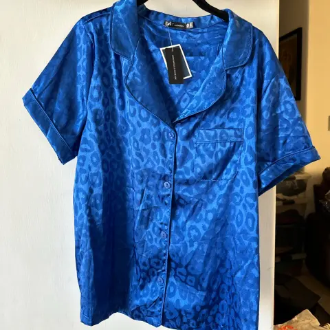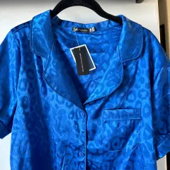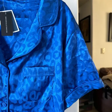 Pijama de satin azul. Es blusa y short, la blusa mide 60 cm de axila a axila y 68 cm de largo, el short mide 42 cm de cintura de lado a lado y 35cm de largo, la tela es satin