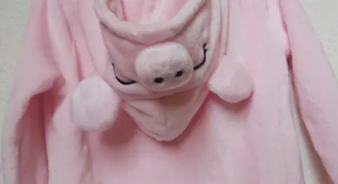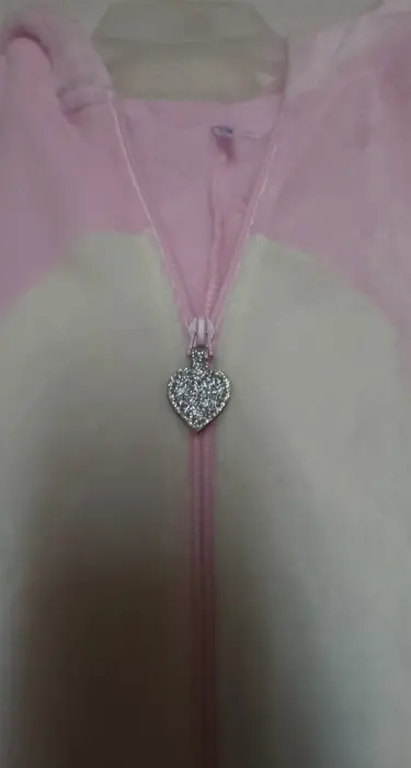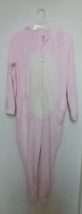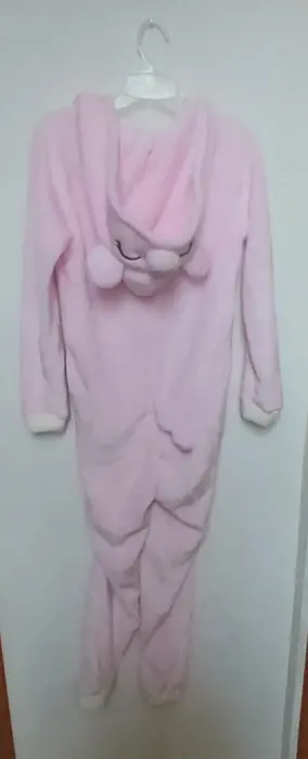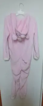 Pijama de cuerpo completo de puerquito. Tela suave, cierre al centro. Colores: Rosa claro y blanco. Lindo detalle de corazón plateado en cierre.