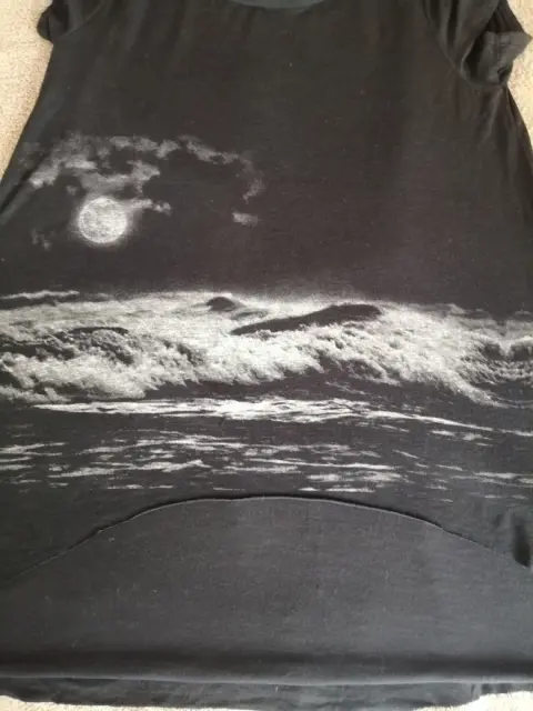 Blusa American Eagle. Playera tono negro, con estampado de luna, T-M, manga corta, axila 48 cms., largo 53 cms. (frente) y 70 cms. (atrás)