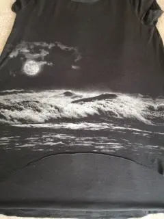 Playera tono negro, con estampado de luna, T-M, manga corta, axila 48 cms., largo 53 cms. (frente) y 70 cms. (atrás)