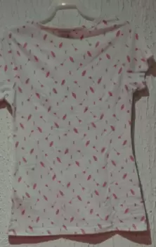 Blusa con estampado. Blusa blanca con estampado color rosa y letras color negro la blusa esta nueva y en buen estado es talla extra chica considero que le puede quedar a una jovencita la tela es delgada pero no se transparenta es perfecto para usarse en época de calor