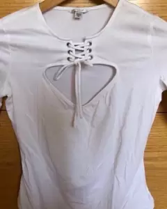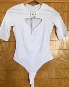 Body con hermoso cruce de trenza con delgadas cintas de la misma tela en delicado escote delantero superior. Fashion, practico y fresco, Tanga-Hilo en la parte trasera inferior, con broches ajustales. En perfecto estado. Talla XS tambien queda a S, la tela estira considerablemente. Medidas: Axilas 42ctm, cintura 38ctm.
