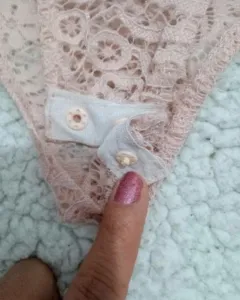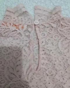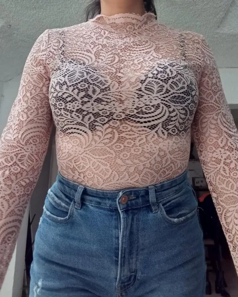 Es transparente de encaje con cuello alto y broche en la parte de abajo