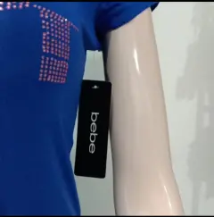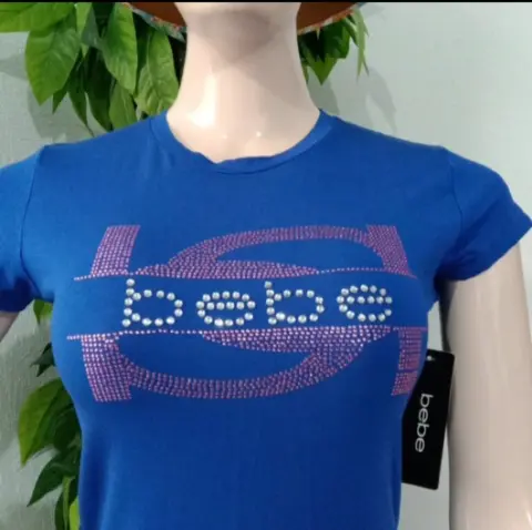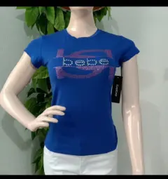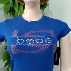 Bonita blusa Bebe. Playera color azul rey con incrustaciones del logo de la marca en color plateado y rosa.Escote redondo. Manga corta.Talla S