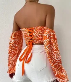 Corset naranja con blanco Liston naranja para sujetarlo Mangas caídas Corto A la altura de la cintura