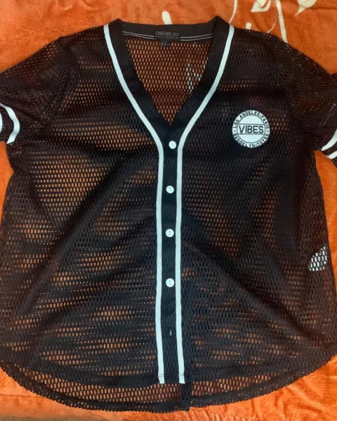 Jersey tipo baseball de red, la tela no estira NO TIENE NINGÚN DETALLE. Medidas: axila-axila 64cm largo 68cm ancho manga 17cm
