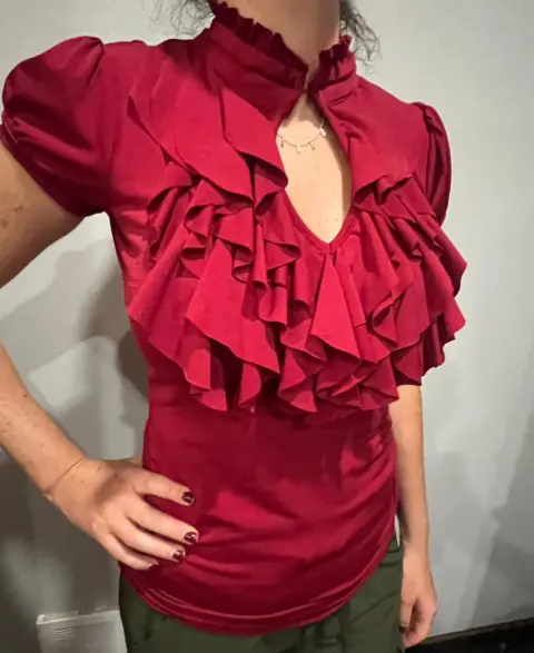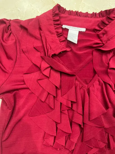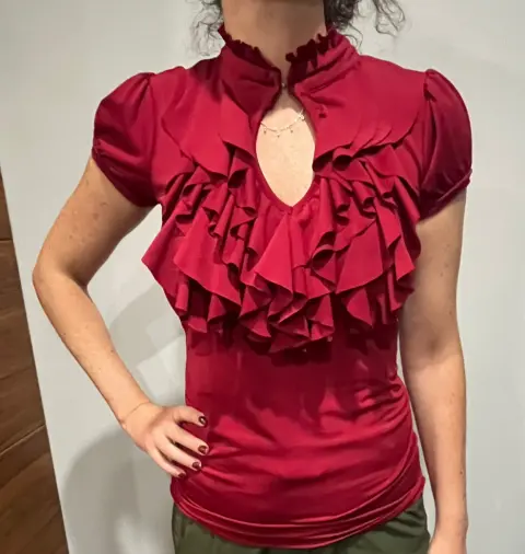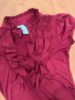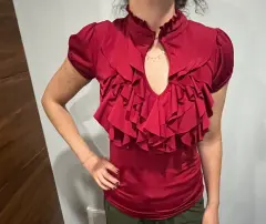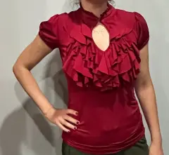 Elegante Playera color vino de olanes con el cuello que se puede desabrocharTela spandexMarca Charlotte RusseTalla s51cm de axila a axila