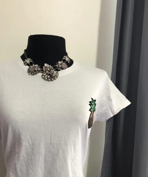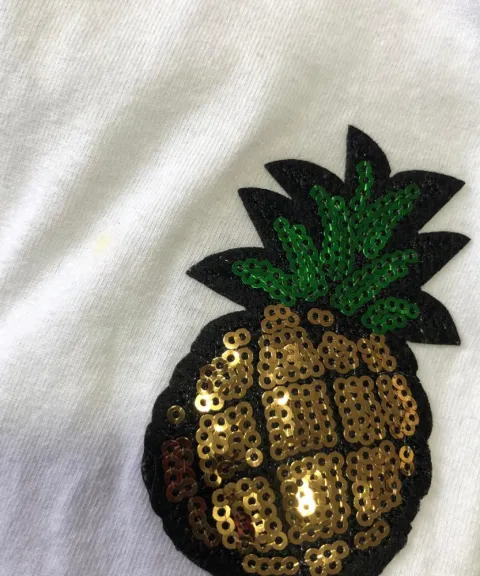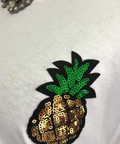 Playera con aplicación de piña en excelente estado, se coloca el precio mínimo pero esta playera está por paquete de tres piezas por el mismo precio