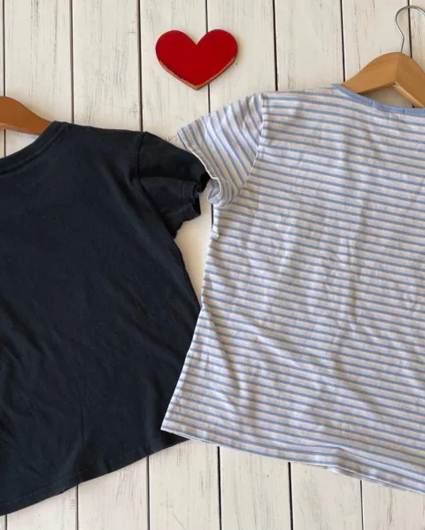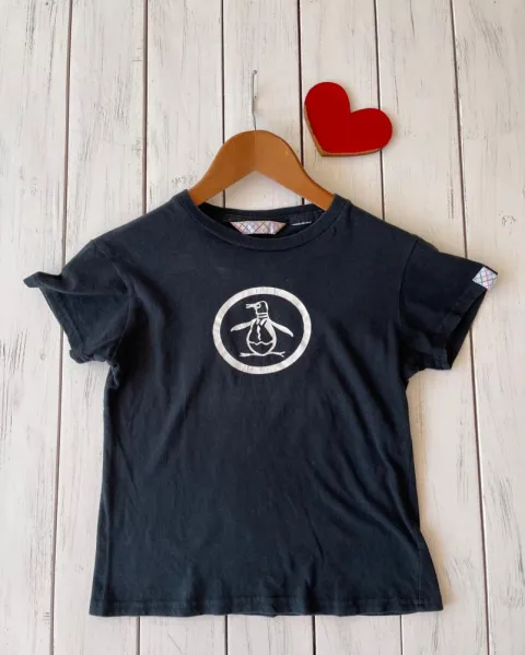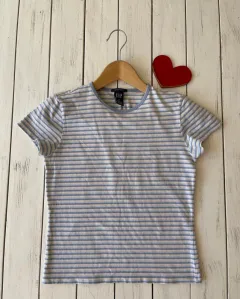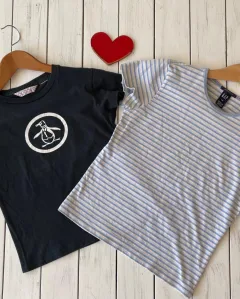 2 playeras manga corta talla XSUna a rayas azules medidas: 35 cm hombros, 40.5 cm axila y 50.5 cm de largo Playera negra (opaca) con dibujo de pingüino (craqueado) tiene un pequeño hoyo al frente. Medidas: 37 cm hombros, 39 cm axila y 46 cm largo.