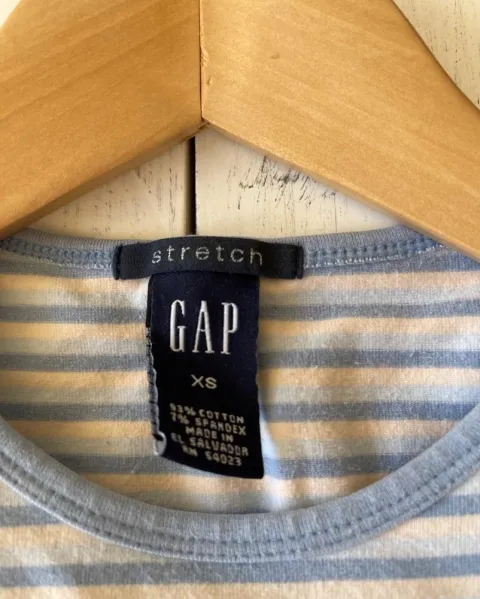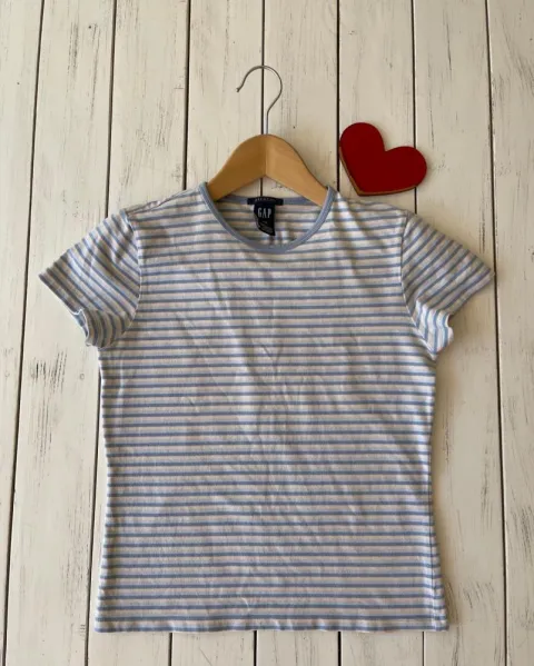 Playera a rayas Gap. 2 playeras manga corta talla XSUna a rayas azules medidas: 35 cm hombros, 40.5 cm axila y 50.5 cm de largo Playera negra (opaca) con dibujo de pingüino (craqueado) tiene un pequeño hoyo al frente. Medidas: 37 cm hombros, 39 cm axila y 46 cm largo.